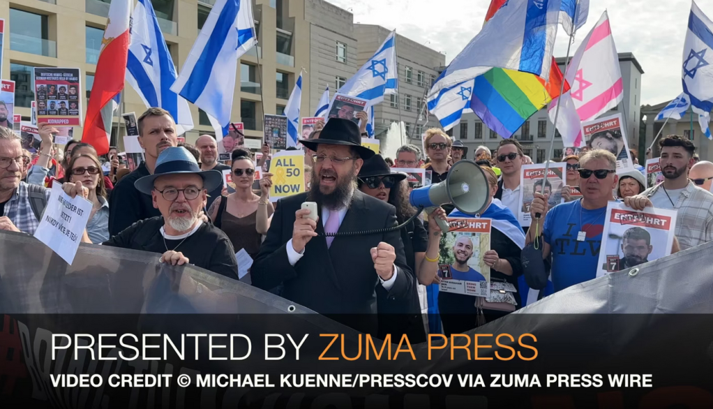 August 7, 2025, Berlin, Berlin, Germany: Dozens of demonstrators gathered Thursday, August 7, 2025, near Berlin’s iconic Brandenburg Gate to demand the immediate return of Israeli hostages held by Hamas in Gaza. The peaceful protest, held at Pariser Platz, drew German Jews, Israeli expats, and supporters waving Israeli flags and holding signs reading ”Bring Them Home Now.” Chants of ”Free the hostages!” and ”Am Yisrael Chai” echoed across the square, a symbolic site just steps from Germany’s Holocaust memorial.