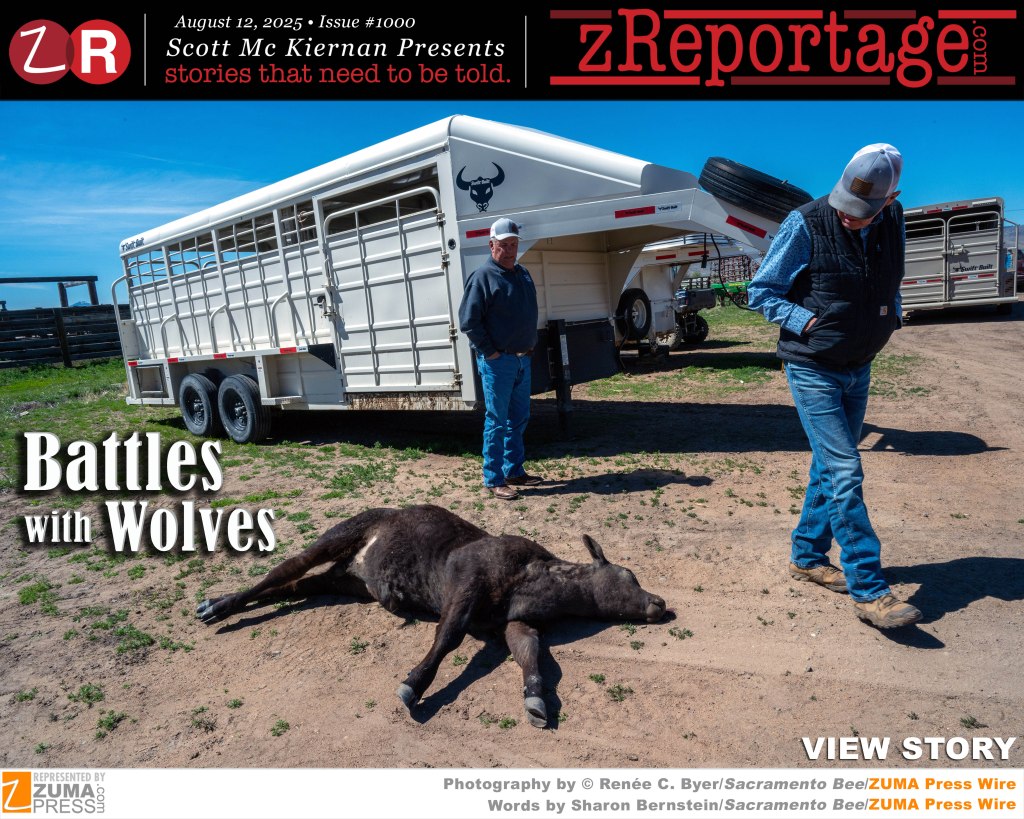 Scott Mc Kiernan Presents zReportage.com Issue #1000 Story of the Week: Published TUESDAY August 12, 2025: ‘Battles With Wolves’ from ZUMA represented Pulitzer winner Renée C. Byer staff at The Sacramento Bee: The return of gray wolves to rural California after over 100 years, may be viewed by some as an ecological milestone, but for ranchers with livestock and families living in these regions, it has ushered in a troubling new reality: the erosion of a basic sense of safety. Five northern California counties have declared public safety emergencies due to wolves, begging the state to allow sheriffs more leeway to, if necessary, euthanize the protected wolves if they pose a danger to people. Today, under state and federal endangered species protections, it’s illegal to kill a wolf unless it presents an immediate threat to a person. The state is beginning a process of re-evaluating protections for the gray wolf, but environmental groups are likely to fight removing endangered species protections for wolves without strong evidence that they are no longer threatened. Welcome to ‘Battles With Wolves’