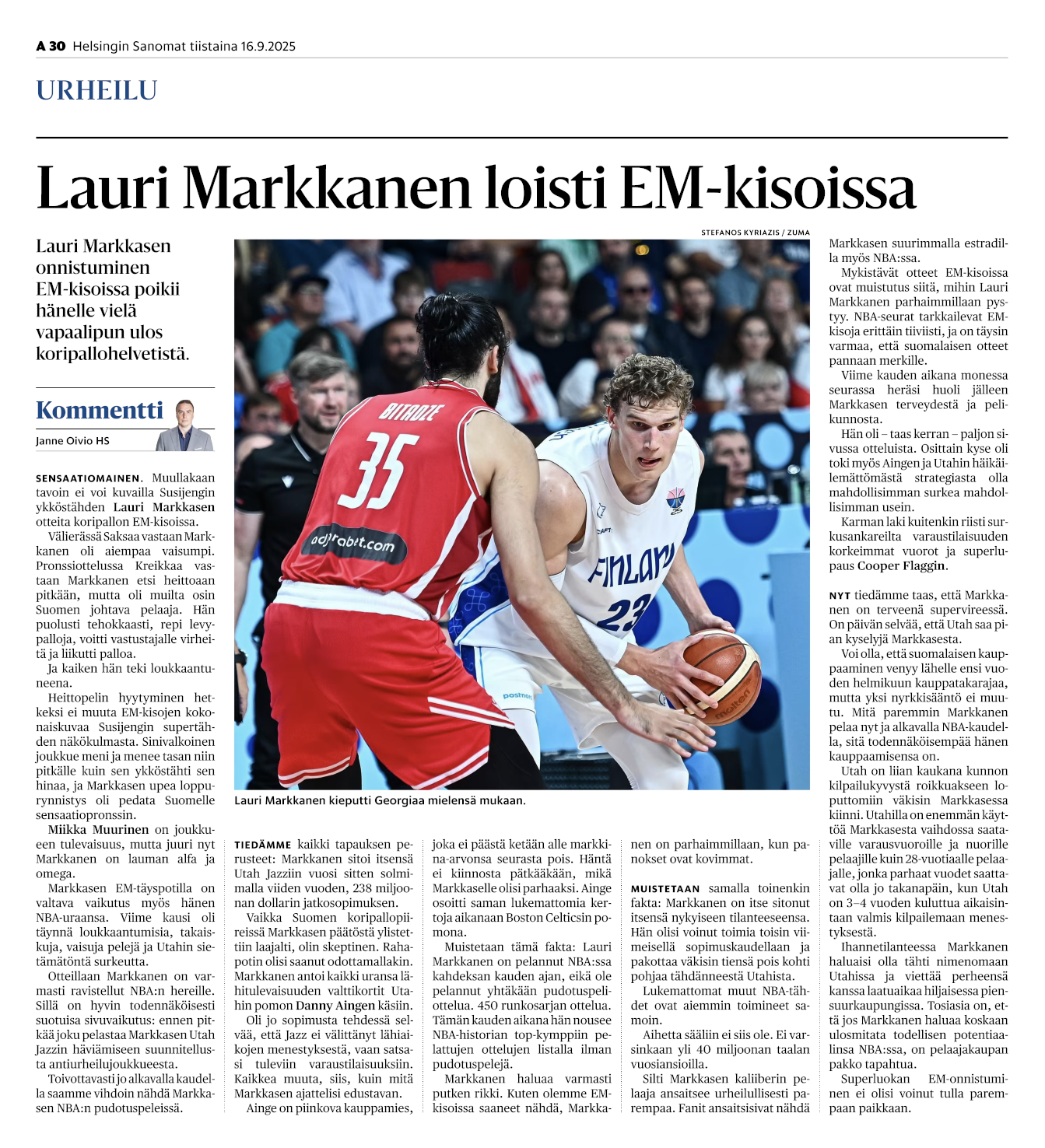 September 10, 2025: Riga, Latvia: 23 LAURI MARKKANEN of Finland competes with 35 GOGA BITADZE of Georgia during the FIBA EuroBasket 2025, Quarter-Finals match between Finland and Georgia at Xiaomi Arena. (Credit Image: © Stefanos Kyriazis/ZUMA Press Wire)