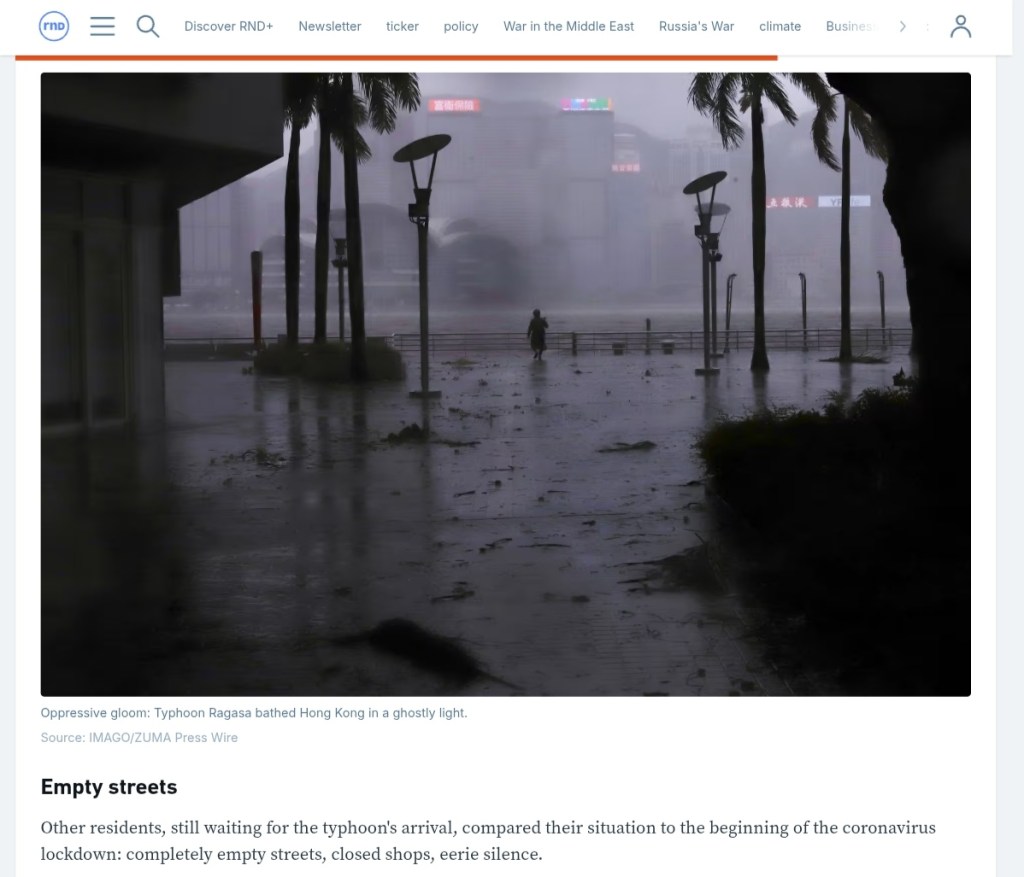 September 24, 2025, Hong Kong, CHINA: In Hong Kong, a lone woman standing near to the stormy Victoria Harbour waterfront this morning as Super Typhoon Signal No.10 RAGASA hit the City with extremely forceful gust wind and heavy shower bringing entire territory to a halt. (Credit Image: © Liau Chung-ren/ZUMA Press Wire)