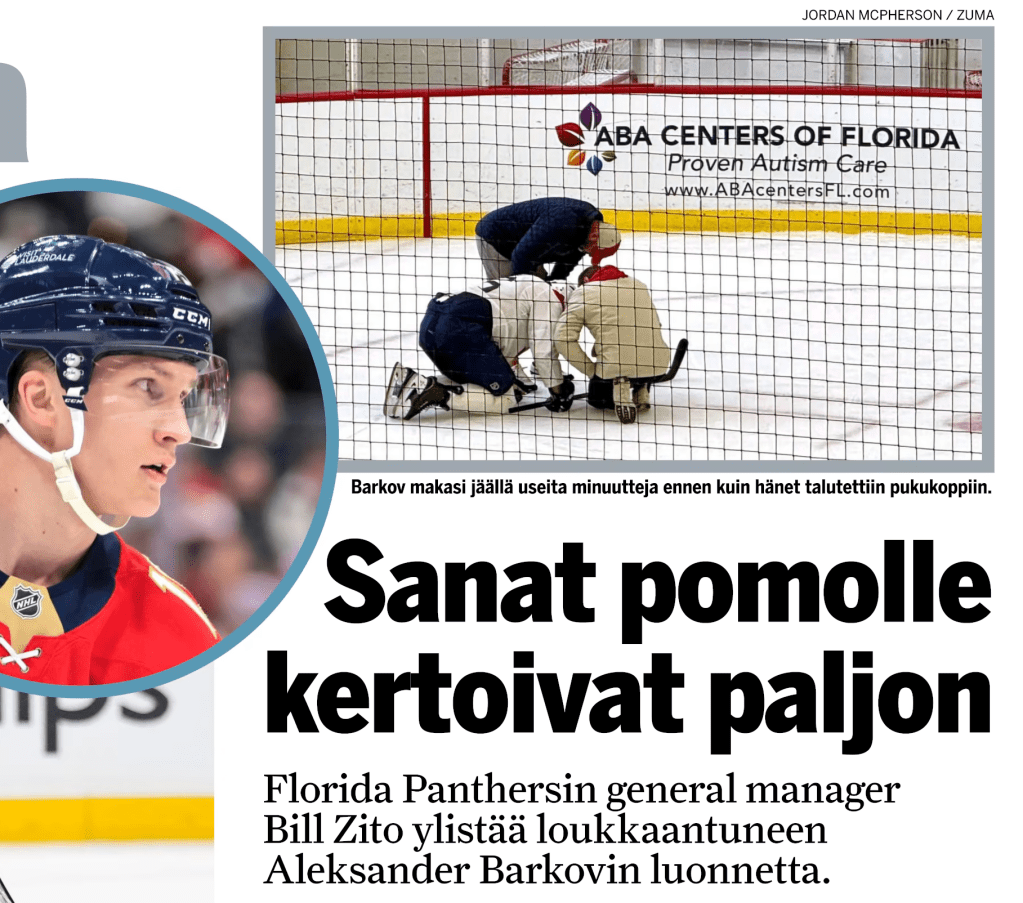 September 25, 2025: Florida Panthers center Aleksander Barkov lays on the ice after sustaining an injury during a training camp practice on Thursday, Sept. 25, 2025, at the Baptist Health IcePlex in Fort Lauderdale, Florida. (Credit Image: © Jordan McPherson/Miami Herald via ZUMA Press Wire)