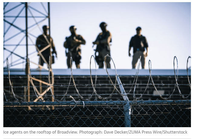 September 27, 2025, Broadview, Illinois, USA: Militarized agents for the United States Immigration and Customs Enforcement (I.C.E.) aka ICE stand guard on the roof top as the Broadview facility’s role has changed dramatically with the start of ‘OPERATION MIDWAY BLITZ’ which is the central processing facility for the operation and is scheduled to operate for 7 days a week for 45 days. (Credit Image: © Dave Decker/ZUMA Press Wire)