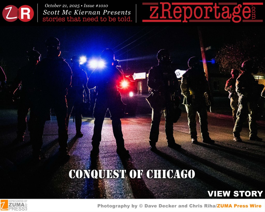 Scott Mc Kiernan Presents zReportage.com Issue #1010 Story of the Week: Published TUESDAY October 21, 2025: ‘Conquest Of Chicago’ by ZUMA Press photo-journalist’s DAVE DECKER and CHRIS RIHA: Fear of ICE raids have shaken Chicago, impacting local residents and businesses, as immigrant labor is critical to Chicago’s economy. US President Trump deployed 300 US troops to Chicago, to address what he said was out-of-control crime. While violence is rare at protests, angry clashes are common and crime is still a serious problem, yet the city’s murder rate has dropped significantly. Overall crime levels in Chicago remain higher than the average for many US cities. What began in September as a crackdown named ‘Operation Midway Blitz,’ has now surged across the city, with regular patrols by masked, armed agents, detentions of U.S. citizens and immigrants with legal status, and at least one fatality. Authorities stated over 1,000 immigrants had been arrested across Illinois so far. Now a Federal Judge in Chicago ruled that ICE agents can face arrest and contempt if they conduct unlawful, warrantless arrests, marking a dramatic shift in immigration enforcement oversight in the city. Welcome to ‘Conquest Of Chicago’