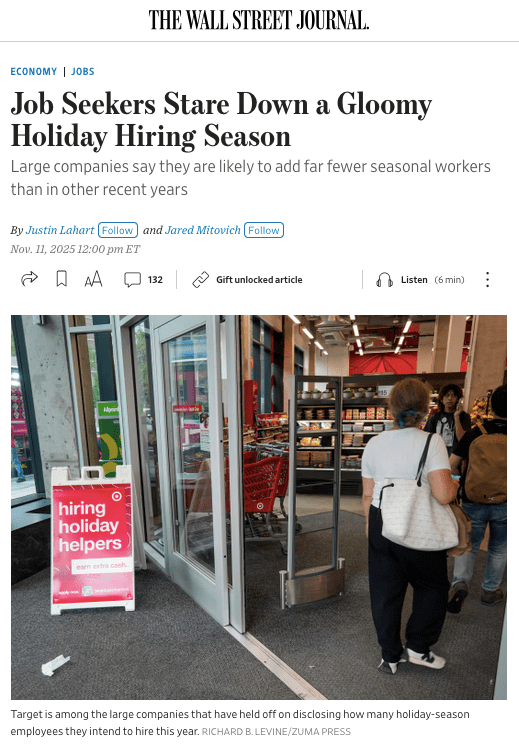 September 29, 2025, New York, New York, USA: Sign at the entrance to a Target store in Chelsea advertises that the department store chain is hiring for the upcoming holidays. ( Richard B. Levine) (Credit Image: © Richard B. Levine/Levine Roberts via ZUMA Press)