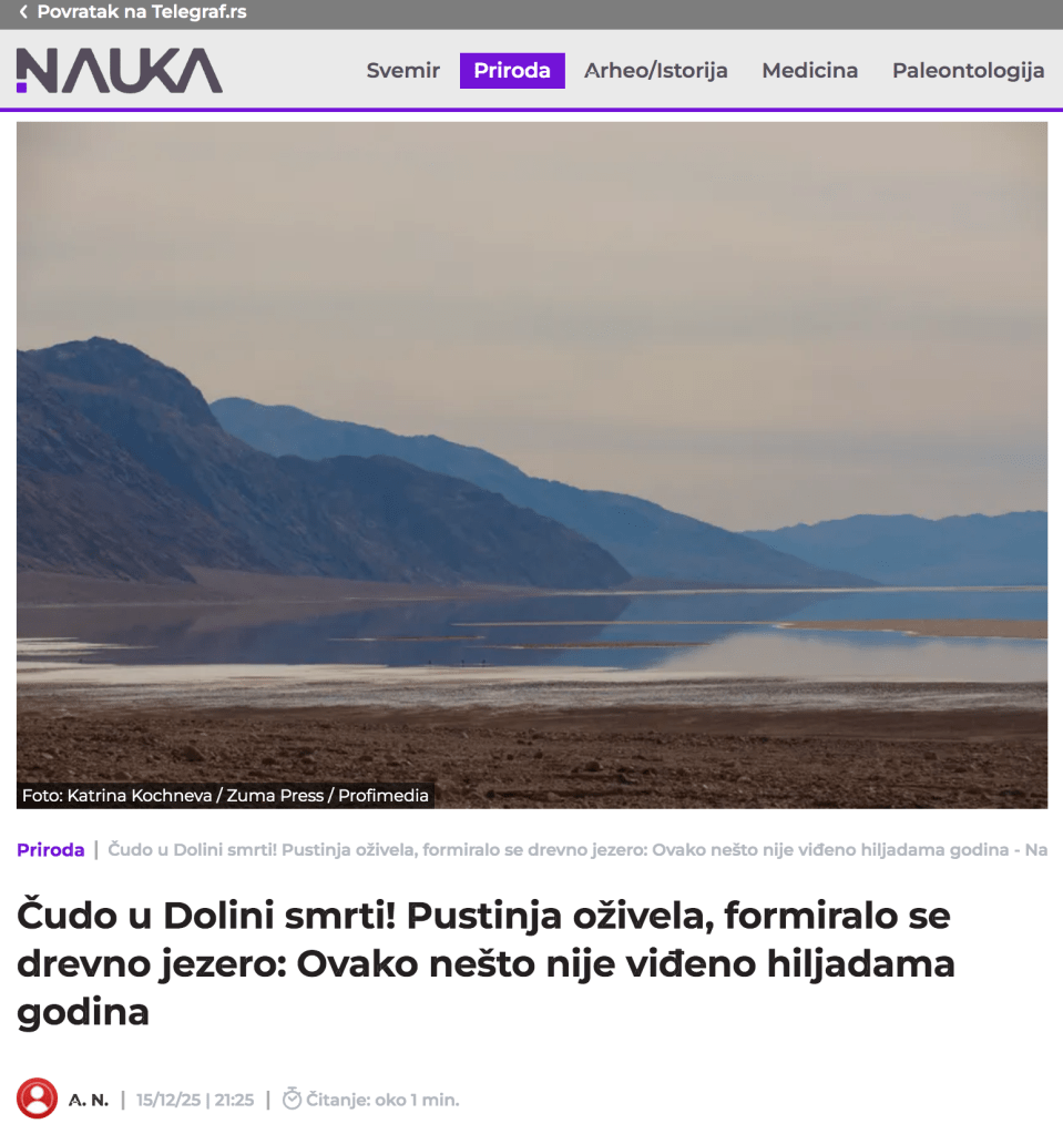 Feb 25, 2024 – Death Valley National Park, California, U.S. – Badwater Basin, which lies at the very bottom of Death Valley, is the remnant of a vast ancient lake that once existed tens of thousands of years ago. It normally averages a paltry 2in (5.08cm) of rain each year. But during the past six months, the valley floor has received nearly 5in (12.7 cm). According to the National Park Service, most of that rain came from two events: 2.2in (5.59 cm) back on 20 August and another 1.5in (3.81cm) during the record-setting ”atmospheric rivers” that have recently drenched much of California. Rain generally evaporates very quickly in Death Valley, but the billions of gallons of water is now a six-mile-long by three-mile-wide lake known as Lake Manly. (Credit Image: © Katrina Kochneva/ZUMA Press Wire)