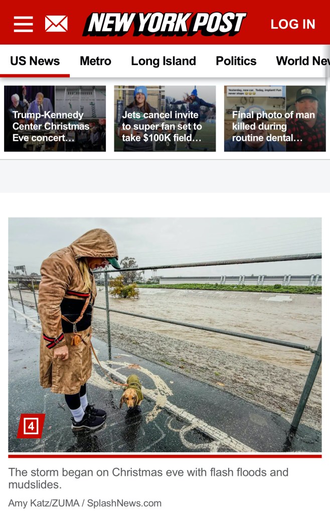 December 24, 2025, Glendale, Ca, USA: A dog in Rain boots is walked by her owner in front of the Los Angeles River which threatens to overflow in Frog Town, Glendale California. (Credit Image: © Amy Katz/ZUMA Press Wire)