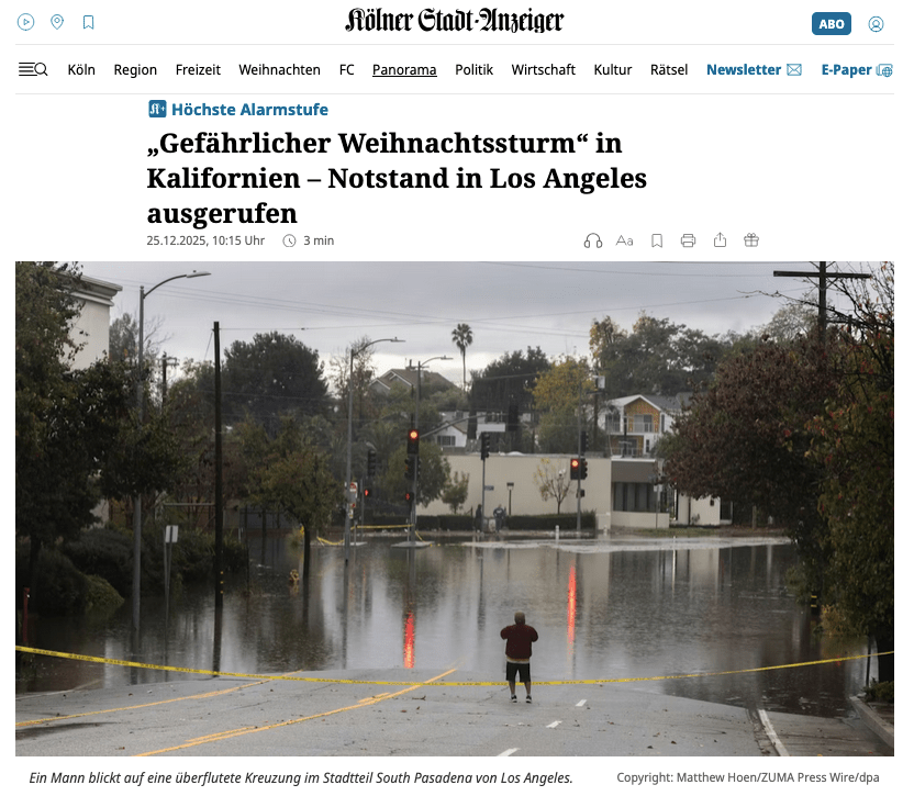 December 24, 2025, Los Angeles, California, USA: A man looks at a flooded intersection in the South Pasadena area of Los Angeles, while threats of flooding and travel delays persist through Christmas. A powerful atmospheric river brings steady rain that officials warn could trigger flooding, mudslides, and debris flows. (Credit Image: © Matthew Hoen/ZUMA Press Wire)