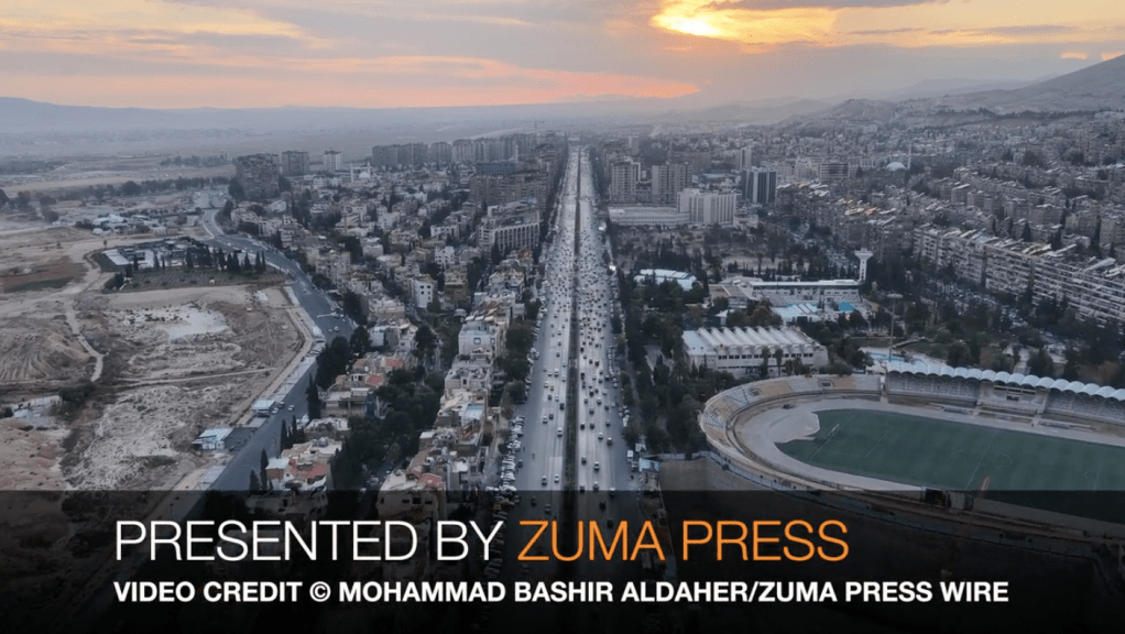 In Damascus, Syria, on December 29, 2025, aerial footage captures the Syrian capital at sunset, showing the city’s skyline, streets, and urban areas as daylight fades over the capital.