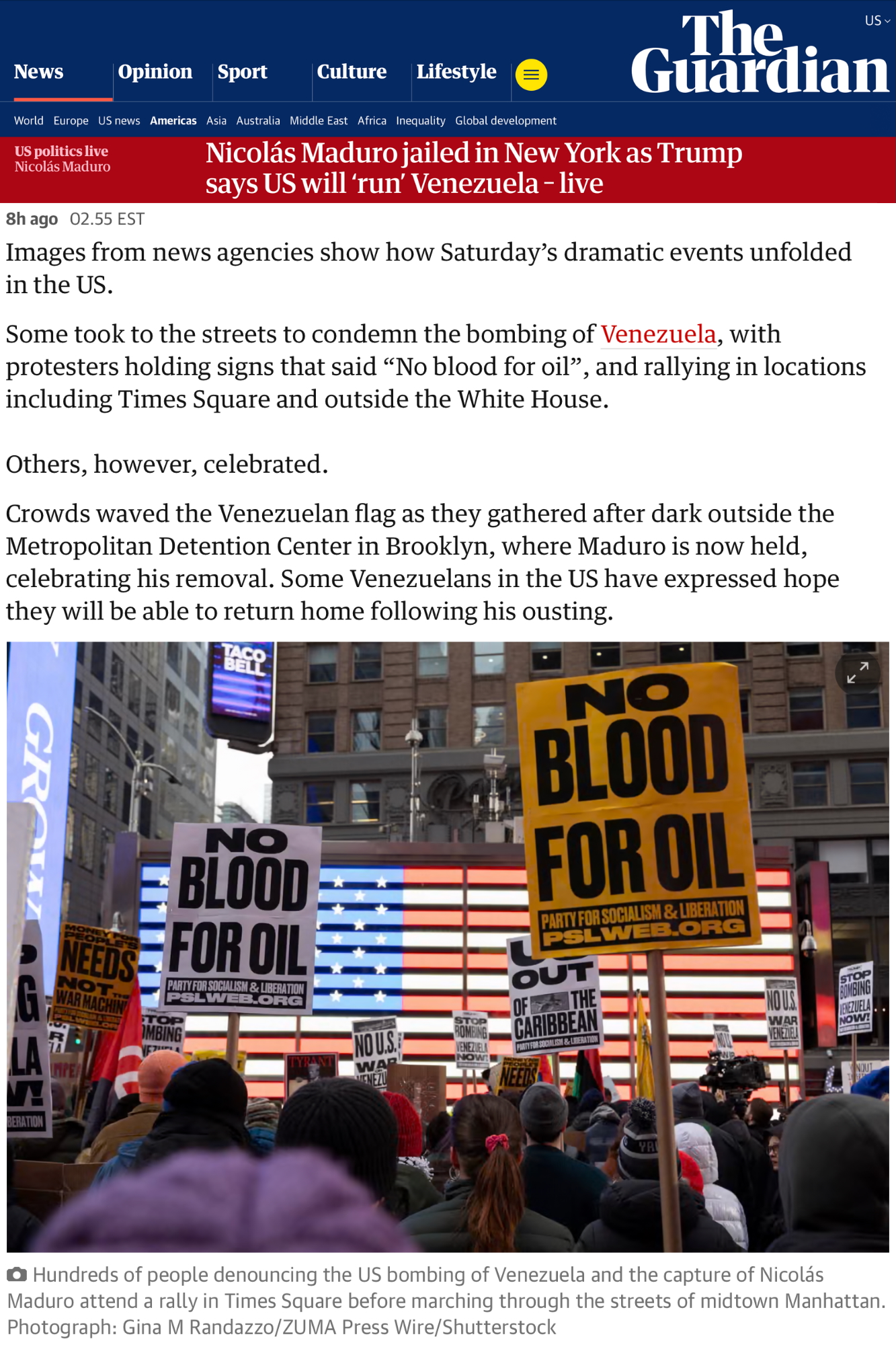 January 3, 2026, New York, New York, USA: Hundreds of people denouncing the U.S. bombing of Venezuela and the capture of President Maduro attend a rally in Times Square before marching through the streets of midtown Manhattan. Rally participants standing next to the lit American flag at the U.S. Armed Forces Recruiting Station hold signs that read ‘NO BLOOD FOR OIL PARTY FOR SOCIALISM and LIBERATION’ ‘US OUT OF THE CARIBBEAN’ ‘NO U.S. WAR ON VENEZUELA’ ‘TRUMP STOP BOMBING VENEZUELA.’ (Credit Image: © Gina M Randazzo/ZUMA Press Wire)