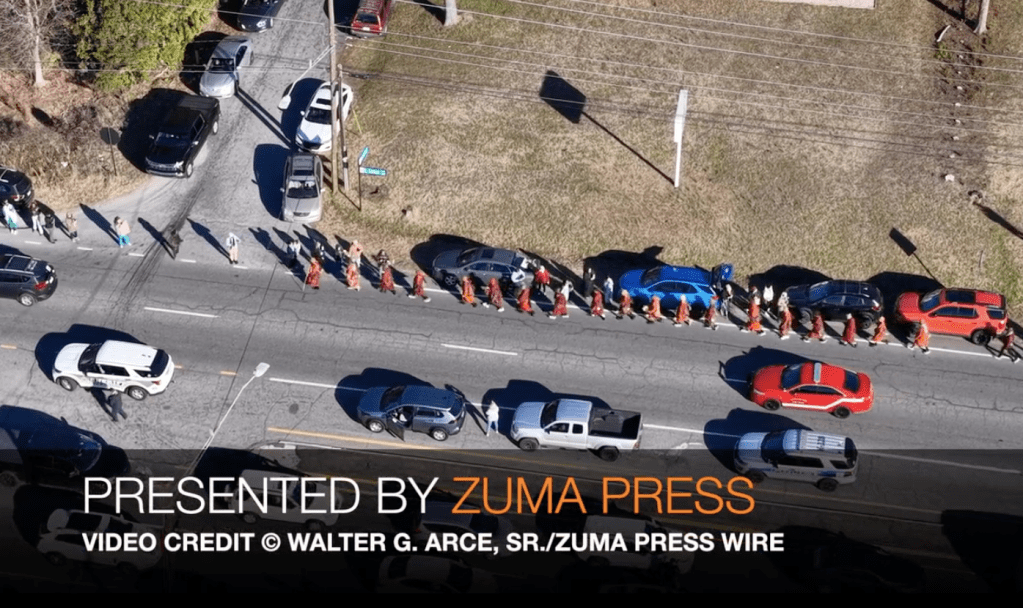 January 16, 2026, Concord, NC, USA: A group of about two dozen Buddhist monks continues their long journey toward the U.S. capital, Washington, D.C., after setting out from Fort Worth, Texas, in late October. The march, spanning ten states, aims to promote a message of peace and nonviolence, following the teachings of the Buddha.