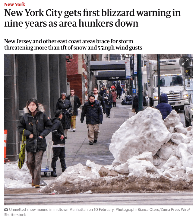 ZUMA’s Bianca Otero on The Guardian, Feb. 21, 2026 Posted by ZUMAPRESS.com on February 25, 2026 Posted in: ZUMALAND. Leave a comment February 10, 2026, New York, New York, USA: An adult woman passes a massive unmelted mound at an intersection in midtown Manhattan. (Credit Image: © Bianca Otero/ZUMA Press Wire) Scott Mc Kiernan, Founder & Editor-in-Chief, ZUMA Press Share this: Share on Facebook (Opens in new window) Facebook Share on LinkedIn (Opens in new window) LinkedIn Share on X (Opens in new window) X Like Loading... Related Posts navigation ← NEW zReportage February 24, 2026: ‘DARK ANNIVERSARY: Four Long Years’