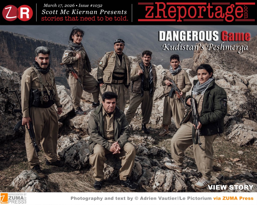 Scott Mc Kiernan Presents zReportage.com Issue #1032 Story of the Week: Published: TUESDAY March 17, 2026: ‘Dangerous Game: Kurdistan’s Peshmerga’ Photography by ZUMA Press represented Le Pictorium agency photographer Adrien Vautier: For Iran’s Kurds, the US-Israeli war against the Islamist regime could be a pivotal moment in their history. The US has made an outreach to Iranian Kurdish dissident groups as ”Operation Epic Fury” rattles the pieces of the Middle East geostrategic chess game. From their mountainous heartland in Iran’s northwestern border region, the Kurds who make up to 17% of the country’s 93 million population, have a long history of resisting Tehran. Their opposition to the current regime dates back to the 1979 revolution. The CIA is working to arm Iranian Kurdish forces with the aim of fomenting a popular uprising in Iran, according to reports. Several Iranian Kurdish groups have released statements since the beginning of the war hinting at imminent action and urging Iranian military forces to defect, yet as the US-Israeli military operation grinds on without a day-after plan for Iran, the country faces the risk of fracturing along ethnic fault lines. Welcome to ‘Dangerous Game: Kurdistan’s Peshmerga’.