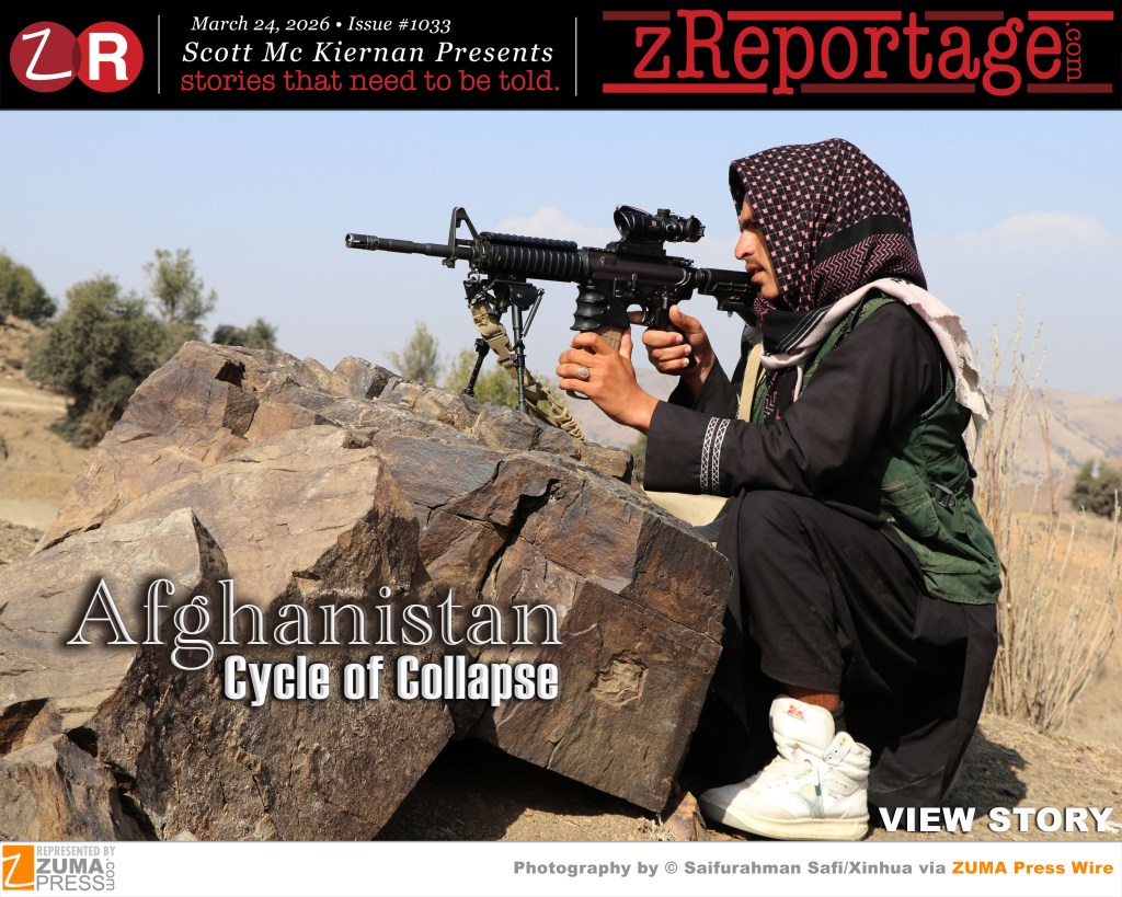 Scott Mc Kiernan Presents zReportage.com Issue #1033 Story of the Week: Published TUESDAY March 24, 2026: ‘Afghanistan: Cycle of Collapse’ by ZUMA Press represented Xinhua photo-journalist Saifurahman Safi: Afghanistan’s cycle of collapse is a four-decade pattern of failed regimes, foreign intervention, and rapid state breakdown. Since the U.S. withdrawal in August 2021, the central Asian country now titled ‘Islamic Emirate of Afghanistan’ has faced a fallen economy, a humanitarian crisis with over 23 million people needing aid, and a strict, authoritarian Taliban regime. Women’s rights have been severely restricted, with girls banned from education beyond sixth grade and most female employment prohibited. While basic commerce continues in local bazaars, the economy is supported by international humanitarian aid and increasingly, economic engagement from China, while Western countries largely maintain sanctions. Now tensions between nuclear-armed Pakistan and Afghanistan’s Taliban regime have sharply escalated since late February after Pakistan declared ‘Open War’ with Afghanistan heightening regional instability and raising concerns about the risk of yet another prolonged conflict. Welcome to ‘Afghanistan: Cycle of Collapse’
