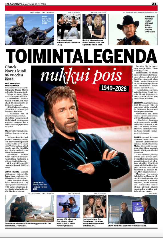 ZUMA in Ilta-Sanomat, Mar. 21, 2026 Posted by ZUMAPRESS.com on April 1, 2026 Posted in: ZUMALAND. Leave a comment Scott Mc Kiernan, Founder & Editor-in-Chief, ZUMA Press Share this: Share on Facebook (Opens in new window) Facebook Share on LinkedIn (Opens in new window) LinkedIn Share on X (Opens in new window) X Like Loading... Related Posts navigation ← ZUMA’s Nikos Katikis/PsnewZ has Doubletruck in Finnish Sports Magazine Urheilulehti ZUMA’s Gina M Randazzo on ‘Le Temps’, Mar. 25, 2026 →
