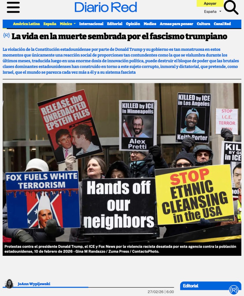 February 10, 2026, New York, New York, USA: Outside of the Newscorp Building in Midtown Manhattan demonstrators chant and hold signs that read ‘FOX FUELS WHITE TERRORISM’ with an image of Fox anchor Laura Ingraham wearing a Klu Klux Klan hood ‘Hands off our neighbors’ ‘STOP ETHNIC CLEANSING in the USA’ ‘RELEASE the UNREDACTED EPSTEIN FILES’ with an image of Jeffrey Epstein and Donald Trump ‘KILLED by ICE in Minneapolis Alex Pretti’ ‘KILLED by ICE in Los Angeles Keith Porter’ with their pictures ”STOP I.C.E. TERROR NOW’ protesting Fox News for their support of President Trump and Immigration and Customs Enforcement (ICE.) Demonstrators cite Fox’s silence after the President’s social media post showing the Obamas as apes and denounce the network for amplifying Stephen Miller and the Trump administration’s demonization of immigrant communities. At a weekly demonstration protesters with the activist groups Rise and Resist and Truth Tuesdays call for Fox to report the truth about Department of Homeland Security (DHS) violence. (Credit Image: © Gina M Randazzo/ZUMA Press Wire)