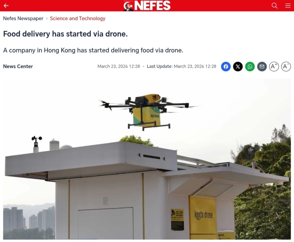 March 22, 2026, Hong Kong, China: A Keeta Drone about to land on the delivery post bringing ordered foods to the customer in the remote place far away from the city centre on Sunday afternoon. Keeta Drone, owned by Chinese on-demand food delivery service giant Meituan kick started Keeta Drone, a food delivery service using its drone delivery service to promote ‘ Low Altitude Economy ‘, an upcoming project by HKSAR. (Credit Image: © Liau Chung-ren/ZUMA Press Wire)