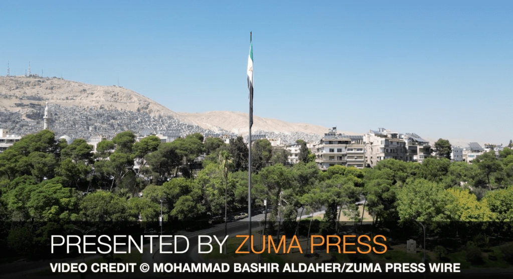 September 7, 2025, Damascus, Damascus, Syria: Aerial view shows the new Syrian national flag flying on a massive pole in the heart of Damascus, with Mount Qasioun, one of the city’s most famous landmarks visible in the background.