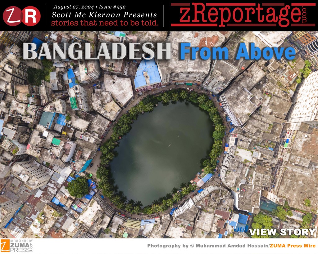 Scott Mc Kiernan Presents zReportage.com Issue #952 Story of the Week: Published: TUESDAY August 27, 2024: ‘BANGLADESH From Above’ by ZUMA Press award winning photo-journalist Muhammad Amdad Hossain: Bangladesh, to the east of India on the Bay of Bengal, is a South Asian country marked by lush greenery and many waterways, its capital Dhaka is widely considered to be the most densely populated built-up urban area in the world. With two-thirds of the country less than 20 feet above sea level and with rapidly growing urban centers, Bangladesh is highly threatened by climate change. By 2050, Bangladesh will lose 17 percent of its territory due to rising sea levels, resulting in the loss one third of the country’s agricultural land. Projected sea level rise of 0.5 meters would contribute to millions of internal migrants by midcentury. If not addressed, these challenges could lead to a proliferation of climate-vulnerable refugee settlements, further straining already limited resources. Welcome to ‘BANGLADESH From Above’