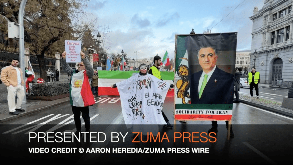 January 17, 2026, Madrid, Madrid, Spain: This Saturday, despite the rain, the demonstrations continued in the Spanish capital. Around one hundred members of the Iranian community marched along Gran Vía, one of the city’s main thoroughfares, to Plaza España, demanding the return of Reza Phalavi to power.
