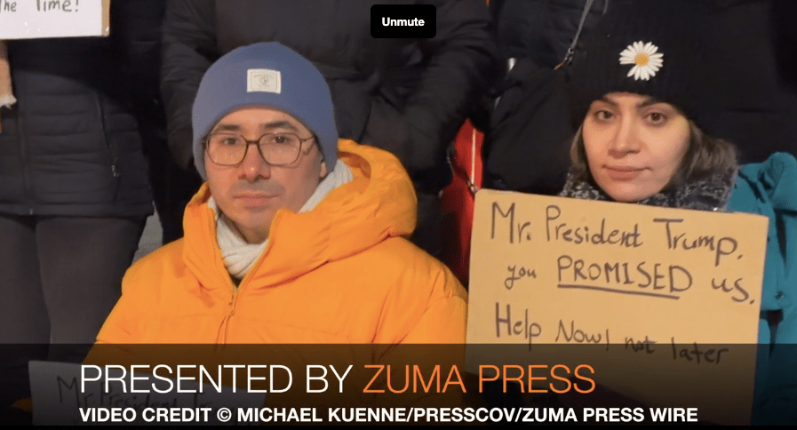 Demonstrators gathered late Sunday night, January 11, 2026, at Pariser Platz near the Brandenburg Gate, assembling in front of the U.S. Embassy to call on President Donald Trump to help Iran, urging U.S. action as protests and reported killings continue inside the country. Protesters held up signs reading “Trump, you promised us,” “Help Iranians now,” and “Now is the time.” Protesters lit candles to mourn people killed in recent days and arranged the candles on the ground to spell out “TRUMP HELP IRAN.”